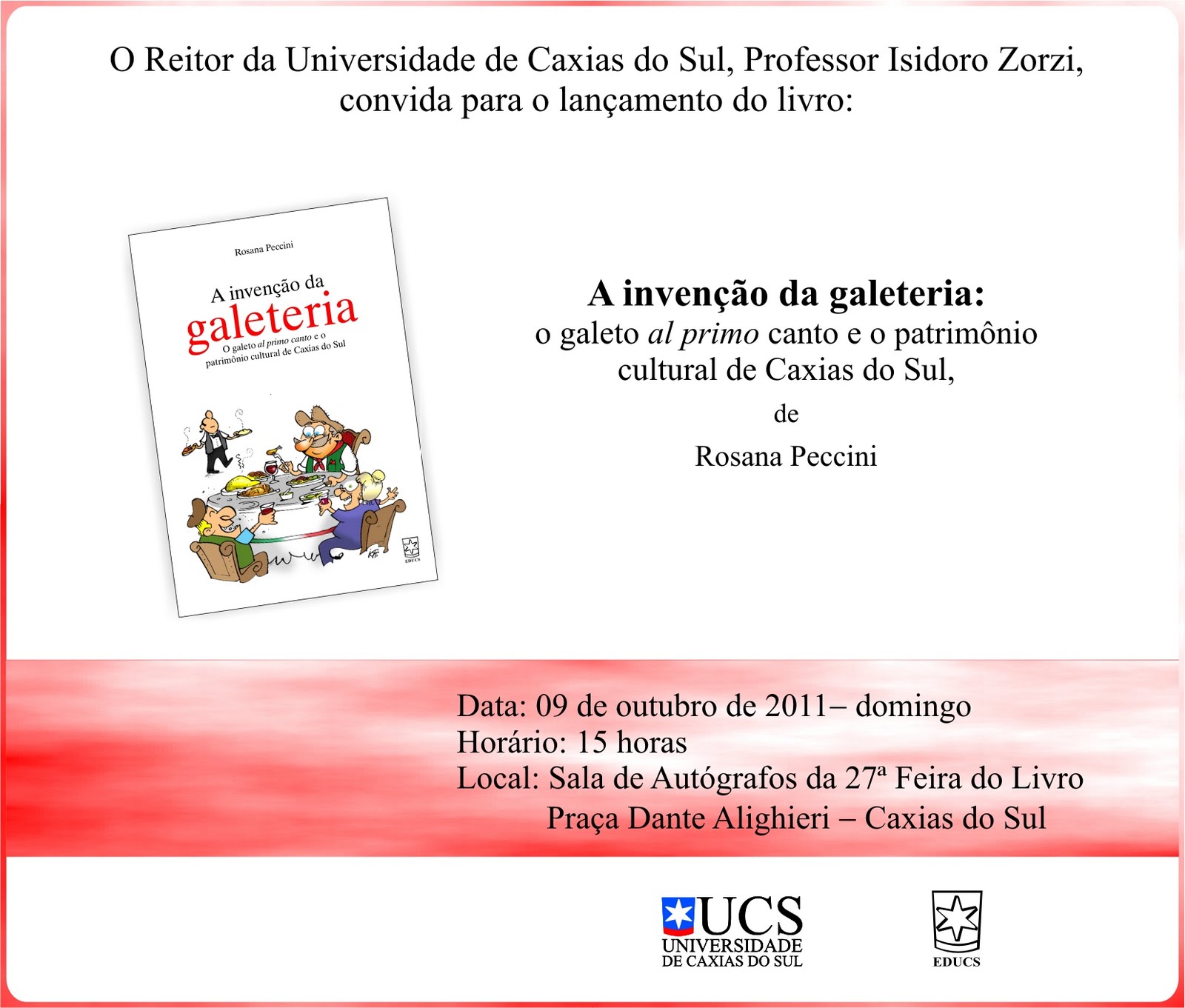 A dissertação de Rosana Pecinni, intitulada História e Cultura da Alimentação: A Galeteria Peccini e o Patrimônio de Caxias do Sul/RS, terá sua versão em livro lançada no dia 9 de outubro, às 15 hs, na Feira do Livro da cidade, realizada na Praça Dante Alighieri. O trabalho foi defendido em 2010, no Mestrado em Turismo. À autora, nossos parabéns.quinta-feira, 29 de setembro de 2011